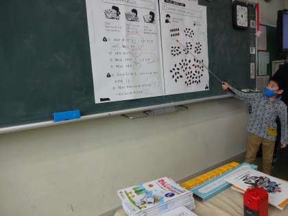 「99より大きい数」を学習しました。教科書に載っている落ち葉の数を数えました。10のまとまりをつくると数えやすくなりました。