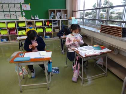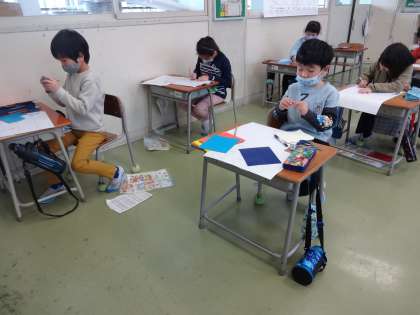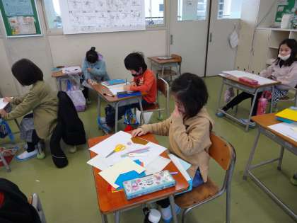 紙版画を製作中です。下書きを仕上げたり、模様の着いた紙を切って貼ったりと、子供たちは、夢中になって黙々と取り組んでいます。