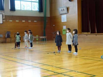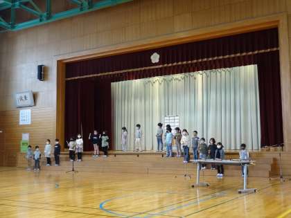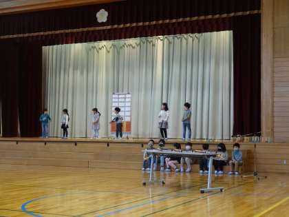 一番目は、1年生です。全校児童の前で少し緊張したようです。