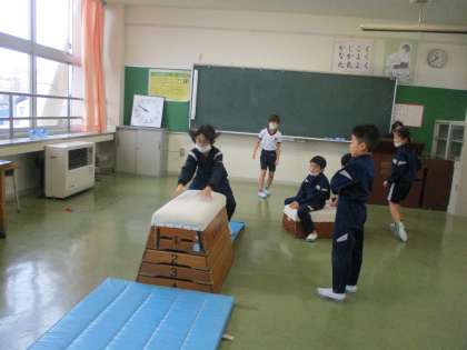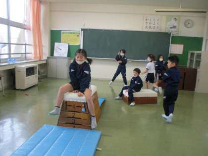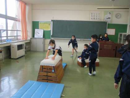 サンサンタイムに学習発表会で行う跳び箱運動の練習をしています。手の付く位置に注意したり、手の使い方に注意したりして休み時間返上でがんばりました。