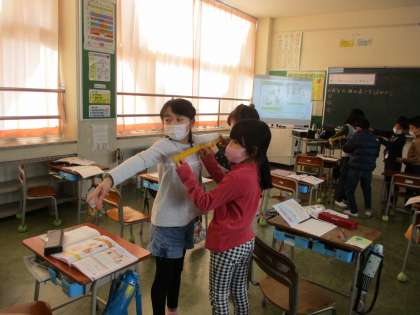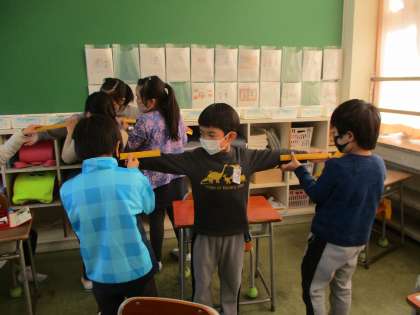 写真は両腕を友達と協力しながら測っているところです。センチメートルより、大きな単位を使った方がよいと気付く子供たちがたくさんいました。