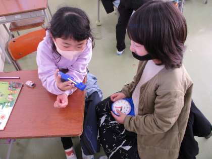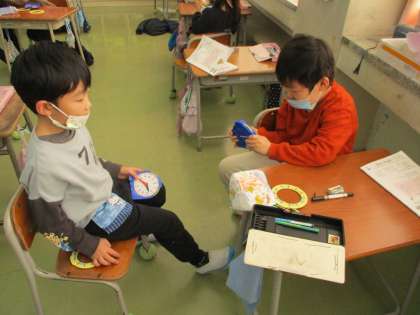 時計の針を見ながら「5,10,15」と声をそろえて「○分」の読み方を確認してから、友達と問題の出し合いをしました。