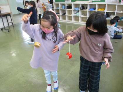 お家の人から教わったことや自分でできるようになったことを友達に教えたり、けん玉の技に繰り返し挑戦したりして過ごしました。