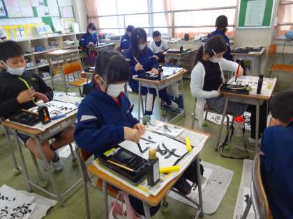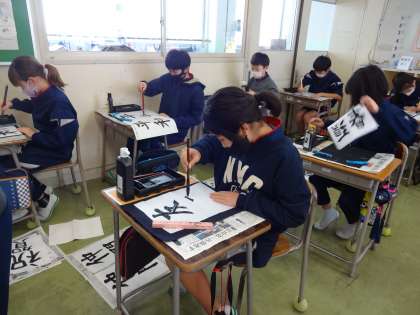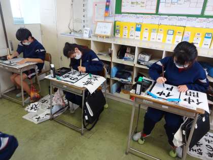 「一期一会」「友情」「笑顔」等、卒業式や入学式の飾り掲示用として、一人一人が、式にふさわしい言葉を選んで半紙に書きました。