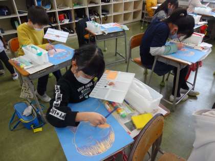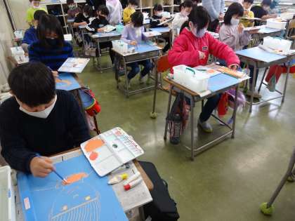 彫刻刀で彫った子供たちは、いよいよ、水彩で色付けです。