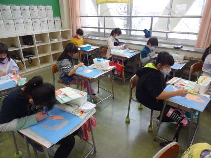 刷るのは後日です。子供たちは、出来上がりを想像しながら取り組みました。