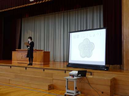 校長先生が、校歌の歌詞の意味と校章、「かしこく、なかよく、元気よく」の話をしてくださいました。