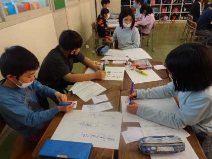 先週、「カンジーはかせの音訓かるた」で、読み札の内容を考えました。今日は、かるたの読み札と取り札を作成し、各グループでかるたを楽しみました。