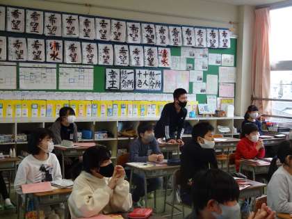 そして、そのワークシートをスクリーンに映しながら、英語で紹介し合いました。