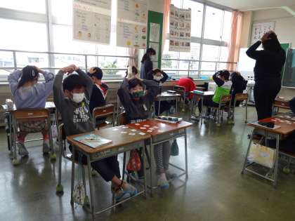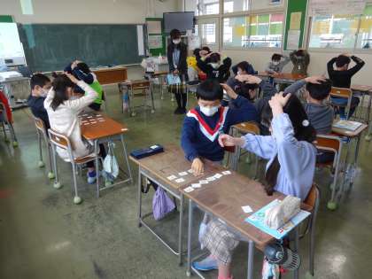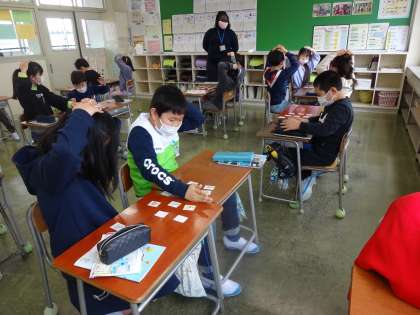 「ぼく・わたしの1日」で学んだ生活行動の言い方をカードゲームを通して復習しました。