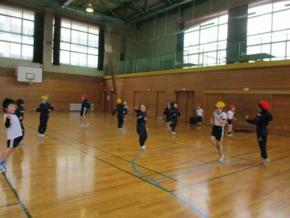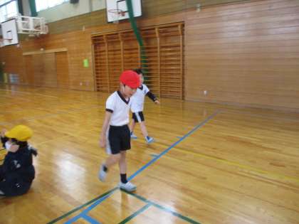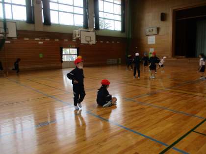 「両足を揃えてジャンプして逃げましょう。」「ひざを伸ばして走って逃げましょう。」「手を腰に置いて逃げましょう。」などのお題に合わせて鬼ごっこをしました。