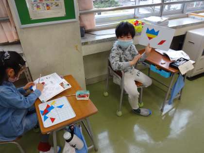 決められた数の色板を使って、教科書に載っている形を作りました。