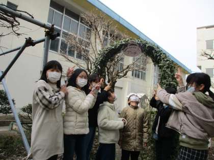 今日で今年度の委員会活動が終わりです。わくわくスマイルフラワーアーチの看板を飾りました。たくさんの子供たちがアーチをくぐるように祈りをこめて飾りました。