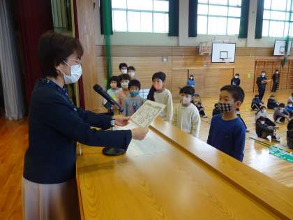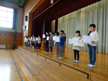第62回富山県小・中・高校生書き初め大会で「推選」「特選」の受賞者、第59回小学生図画コンクールで「入選」「佳作」の受賞者に、校長先生が賞状を授与して紹介しました。