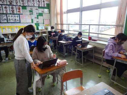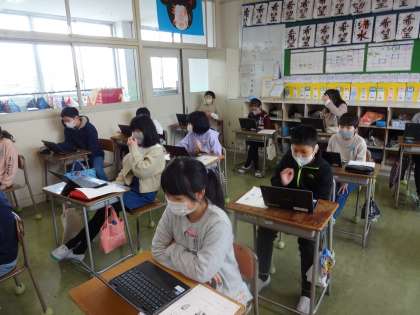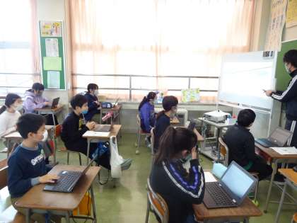 全員が、5年1組のクラスルームに入り、担任が作ったアンケートに答えることができました。教え合う姿も見られました。