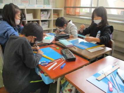 カラーストローと粘土玉を使って、直方体と立方体の模型を作りました。作った模型を比べてそれぞれの辺の数と頂点、長さを確認しました。