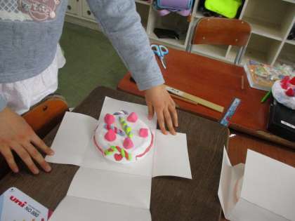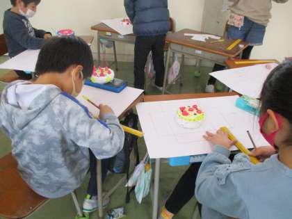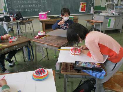 箱の形の特徴を踏まえて、以前、図画工作科で作ったケーキの箱作りをしています。辺の長さや辺の数、面の数に気をつけながら進めることができました。