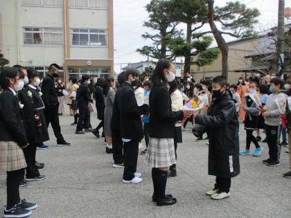 卒業生代表が万歳をした後、5年生が、卒業生に花束を贈りました。