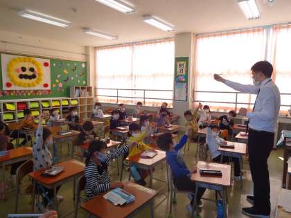 先生の話を聞いて鉛筆を持ち、先生に見えるように手を挙げました。