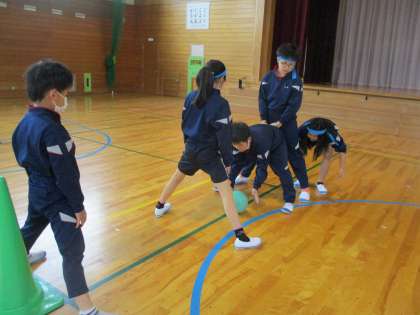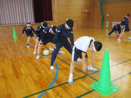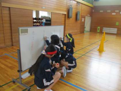 ウォーミングアップでいろいろなリレーをしました。バトンをボールにして、足の間からボールを通してリレーをしたり、正面のホワイトボードを使ってしりとりをしながらリレーをしたりしました。各団で作戦を考えながら取り組むことができました。