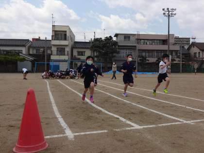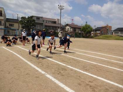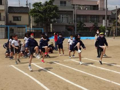 50m走の記録向上を目指して、ウオーミングアップや練習をしました。