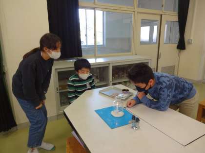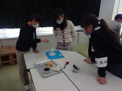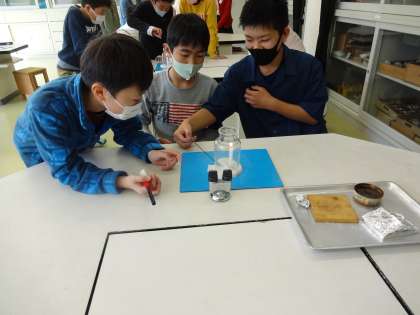 上下に穴が開いている集気瓶と、下のみに穴が開いている集気瓶の中で、ろうそくの火は燃え続けるかを実験しました。