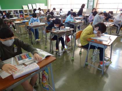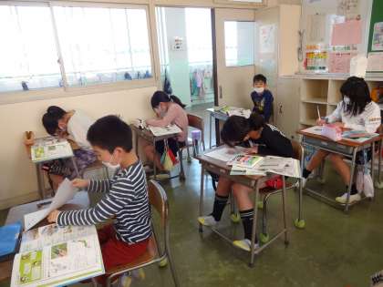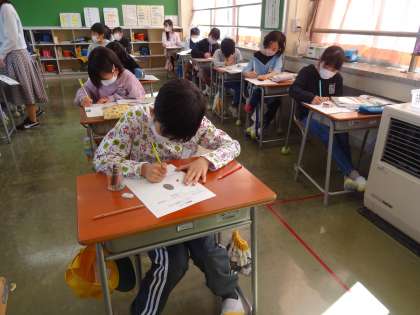 子供たちは、よく観察して、種の特徴を絵や文で表現しました。特に、絵は、複数色を使ったり、色を塗る方向を考えたりと、丁寧に描きました。