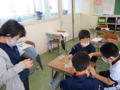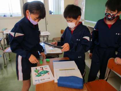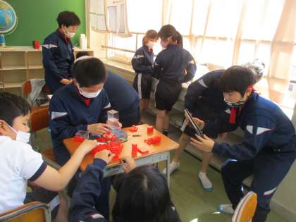 新しくなった色団に分かれて24個の積み木を利用して様々な形の直方体をつくりました。縦、横、高さそれぞれいくつ積み木が組まれているか、ノートとChromebookのカメラ機能を使って記録しました。