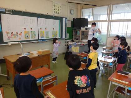 歌に合わせて、あ行の平仮名を楽しく覚えました。