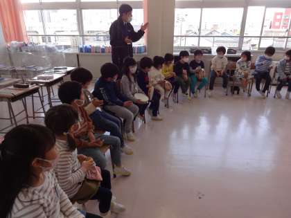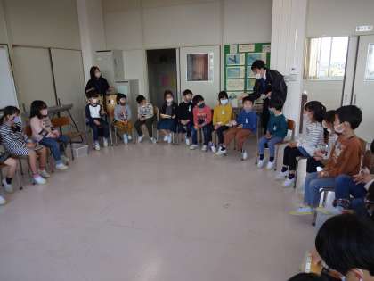 後半は、円陣をつくり、「フルーツランド」というリレー形式の活動をしました。カスタネットやタンブリンでリズム打ちをしました。