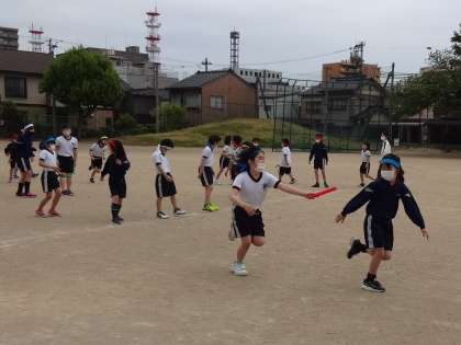 リードしながら、バトンパスをする練習をチームごとで行いました。(2、3枚目の写真)