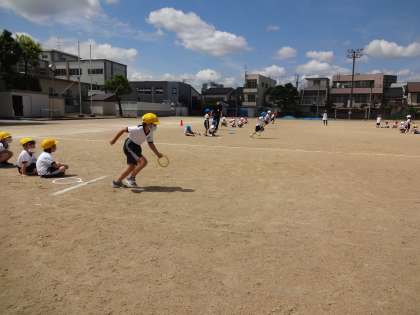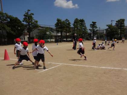 運動会で行う折り返しリレーをしました。初めてのリレーなので、戸惑う子供がいました。手順やルールを覚えて、楽しく競え合えるように学習していきます。
