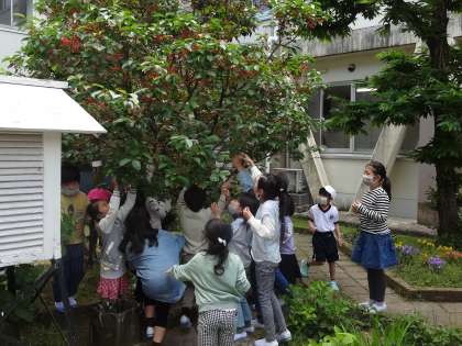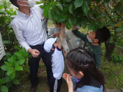 本校の中庭には、いくつか実のなる木々があります。中庭の実の食べ方のルールを守って、食べることができます。