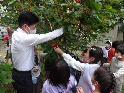 最近、業間の休み時間になると、中庭の中央に子供たちが集まります。お目当ては、「サクランボ」です。