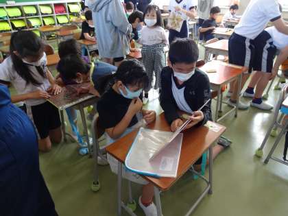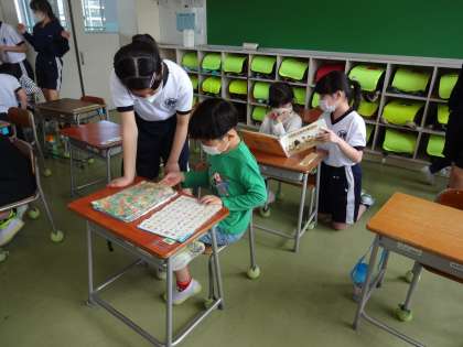 1年生教室に6年生がいます。1限目に、クロームブックを使ってアンケート回答をするために助けました。それが終わった子供から、読み聞かせをしたり、話し相手になったりしています。