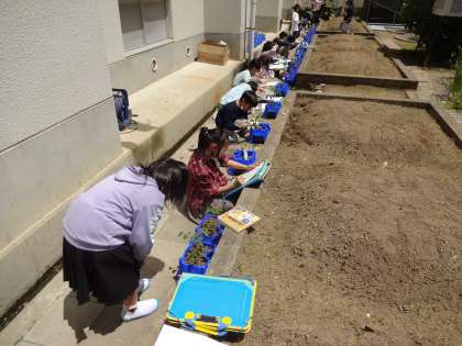 昨日植えた野菜の苗を観察して、ワークシートに書きました。天気がよいので、水もあげました。継続して観察しながら育てていきます。