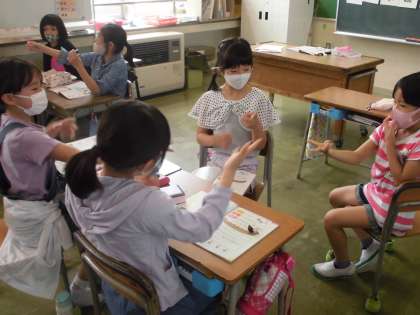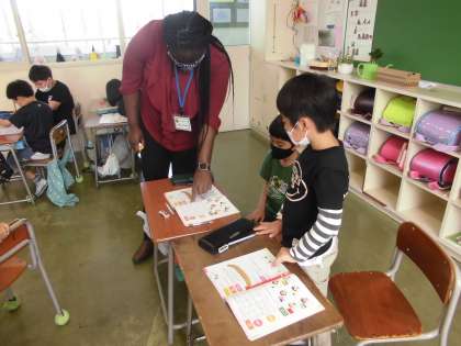 じゃんけんをして勝ったら○、あいこだったら△、負けたら×を書き、○の数を答えました。楽しく英語を学びました。