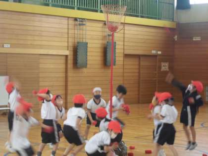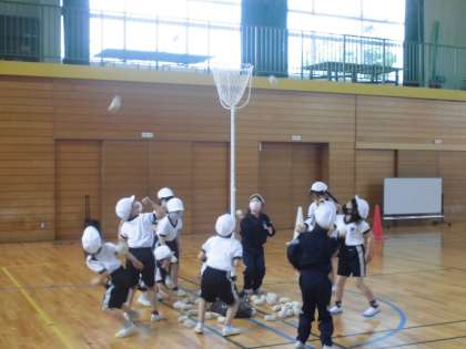 1、2年生は、合同体育で、運動会で行う玉入れの練習を行いました。