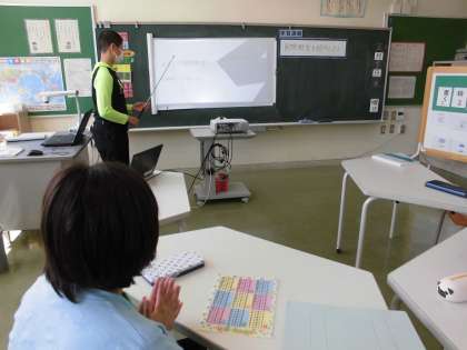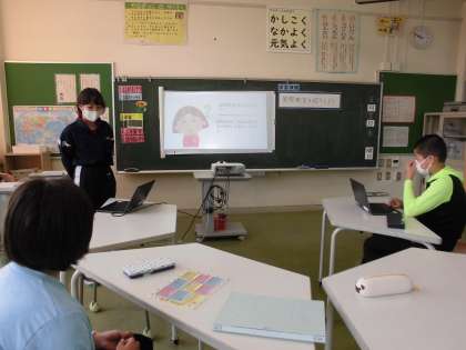 新しい友達に、国際教室のことを紹介しました。スライドを使って上手に発表することできました。