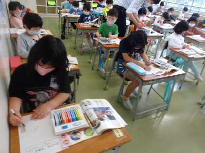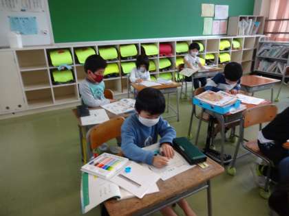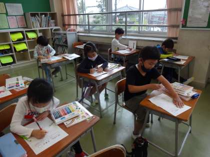 先週、生活科の学習で中庭の観察をしました。今日は、そのときに発見した生き物や植物等について、カード(はっけん かあど)に絵を描きました。