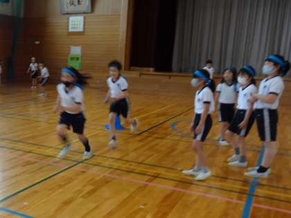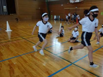 今日の体育科の授業は、体育館で行いました。限られたスペースで、リレーのバトンパス練習をしました。