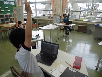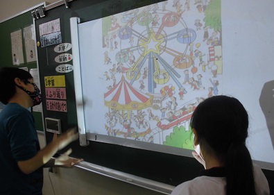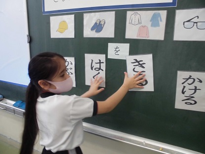 「くつをはく」「帽子をかぶる」「めがねをかける」など、言葉の組み合わせを覚えています。ヒントを出し合いながら、絵の中の人物を探すゲームにも取り組みました。
