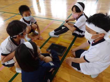 リレーのバトンパスがスムーズにできるようにと、各色団ごとにクロームブックで動画を撮り、振り返りをしました。