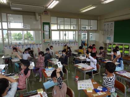 先生が示した数字フラッシュカードを声に出して読んだり、先生が拍手した回数を数えて自分の数字カードで示したりしました。