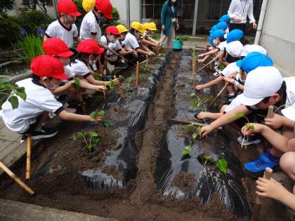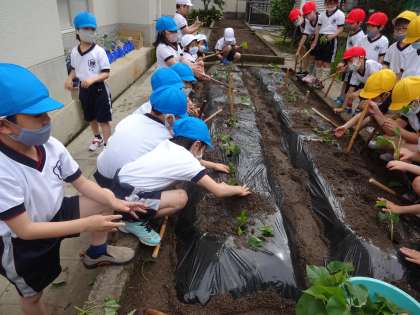 1年生は、サツマイモの苗を植えました。棒で穴を空け、苗を入れて土をかぶせました。中庭で育てるので、成長する様子をすぐに見ることができます。