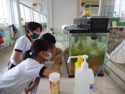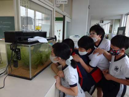 理科の学習のために5年生教室で飼っているメダカが、産卵しました。水草に産み付けられた卵を見付けた子供たちから、喜びの声が上がりました。