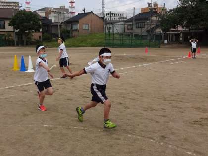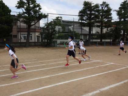 バトンを渡す人の「はい。」の合図に合わせ、もらう人が手を後ろに出します。短時間でバトンパスができるようになってきました。