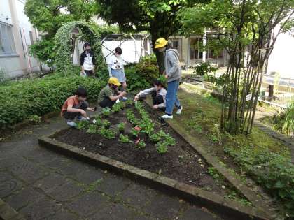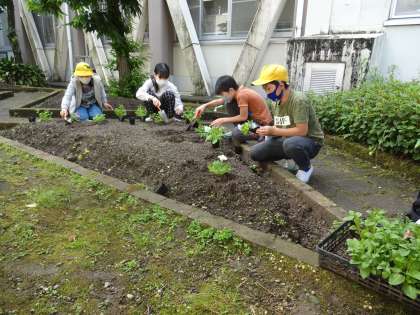 始業前に飼育栽培委員会の子供たちが中庭にいました。花壇に花の苗を植えています。花の名前は、ペチュニアです。今後、サルビア、マリーゴールドも植えます。ありがとう。