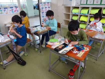 はさみの扱い方に慣れてきた子供たちは、紙をいろいろな形に切ったりつなげたりしながら、飾りを作っています。夢中になって取り組んでいます。