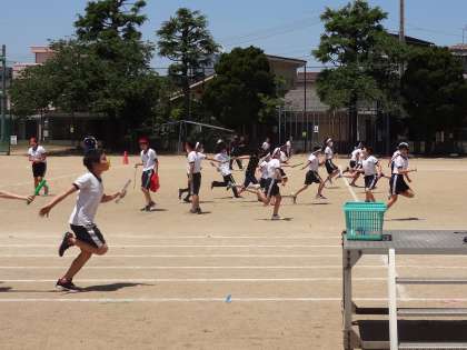 運動会のリレーでは、どの色団もよい成績を収めたいと強い思いをもっています。疲れるのではないかと心配するのは先生のみで、子供たちは、その心配もよそに何度もバトンパスの練習を行っています。